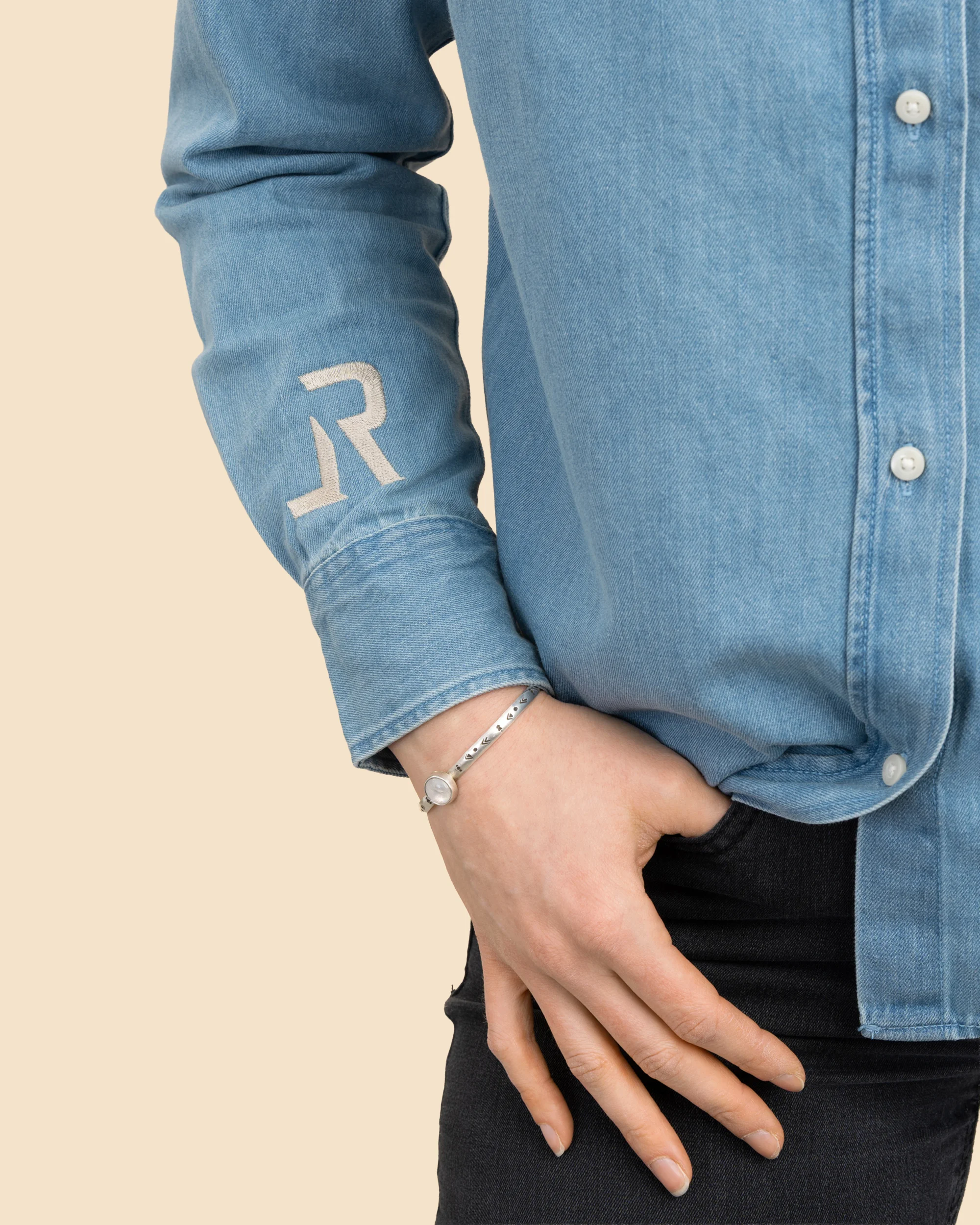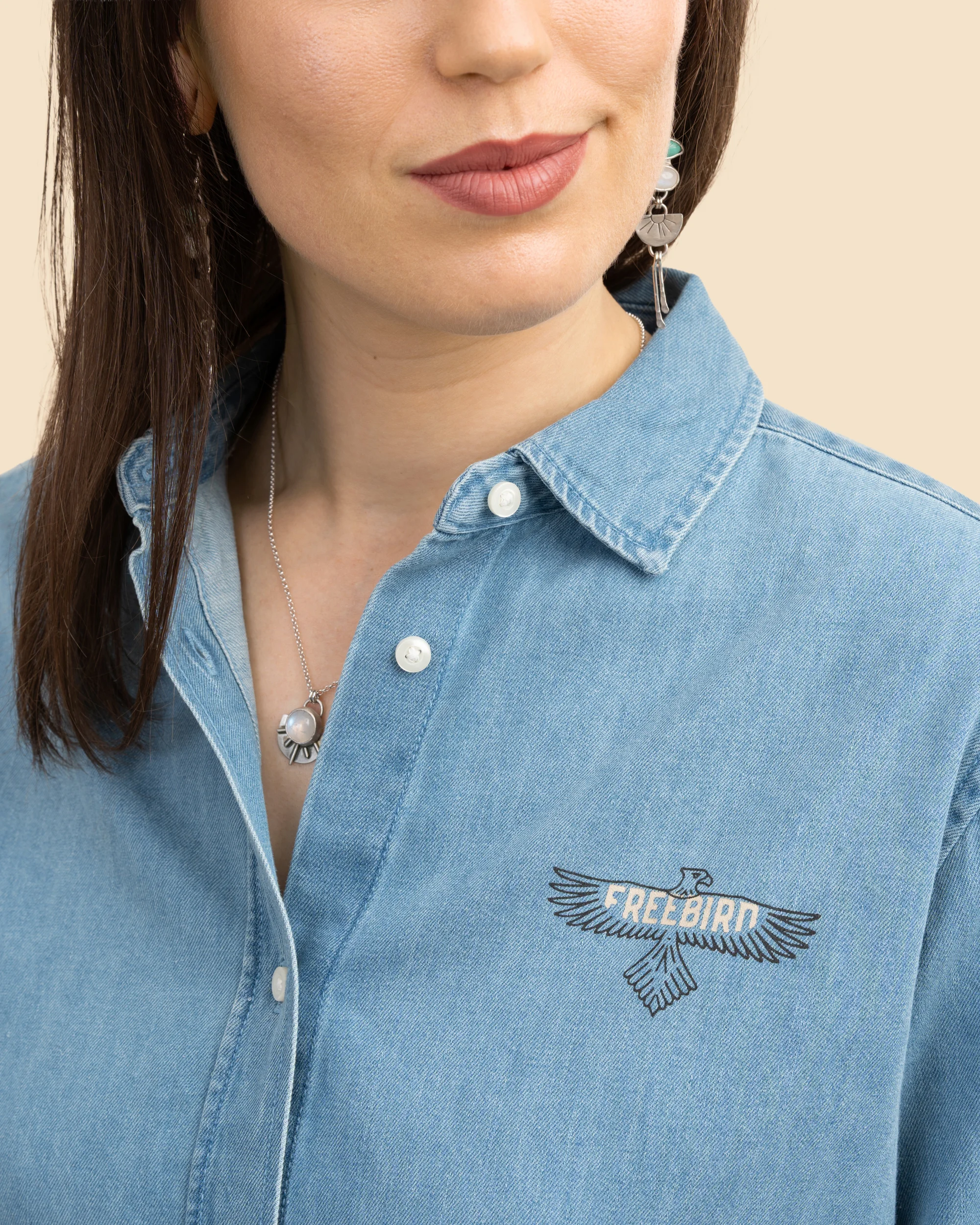 Thoughtful design details give this Denim Shirt its unique FREEBIRD identity: a Desert beige LR embroidery on the right sleeve, a small FREEBIRD print placed over the heart, and a beautiful Aztec-inspired artwork across the upper back, printed in Aloe and Rosewood tones with a sun motif that adds warmth and Western character.