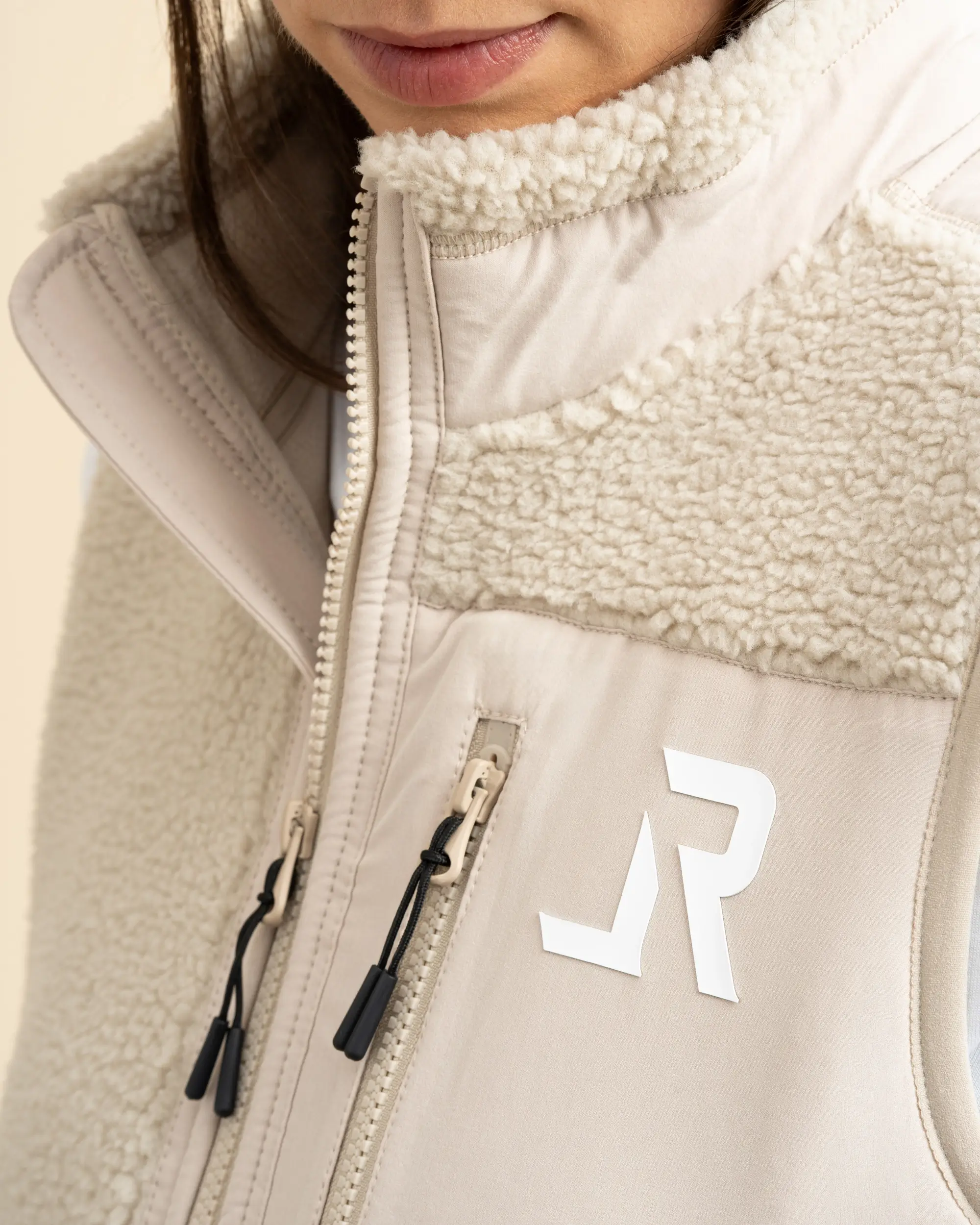 The outer shell is made from 100% recycled Sherpa, delivering a soft and durable surface. Inside, a recycled polar fleece lining with anti-pilling finish provides reliable insulation and long-lasting comfort. Elastic recycled binding at the cuffs and hem ensures a clean silhouette and a secure fit.